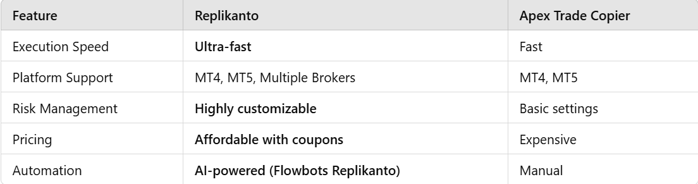 While Apex Trade Copier is a decent option, Replikanto stands out for traders who want: